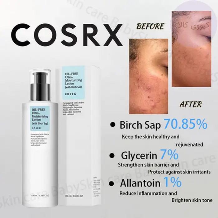 لوسیون مرطوب کننده فاقد چربی کوزارکس COSRX مدل Ultra-Moisturising از هیالورونیک اسید برای آبرسانی عمیق و همچنین عصاره لیمو برای شاداب کردن پوست صورت و عصاره درخت چای استفاده شده تا مناسب هر پوستی حتی پوستهای حساس و مستعد جوش باشد.
