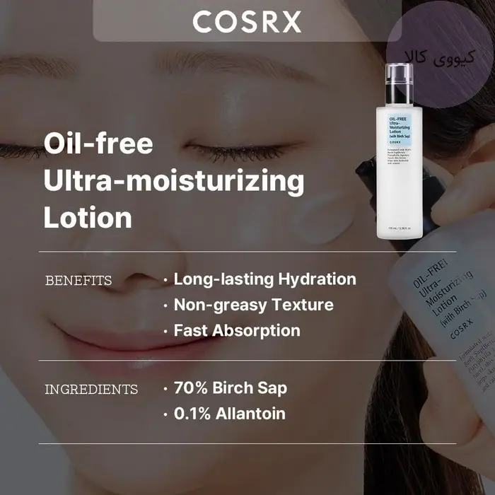 لوسیون مرطوب کننده فاقد چربی کوزارکس COSRX مدل Ultra-Moisturising از هیالورونیک اسید برای آبرسانی عمیق و همچنین عصاره لیمو برای شاداب کردن پوست صورت و عصاره درخت چای استفاده شده تا مناسب هر پوستی حتی پوستهای حساس و مستعد جوش باشد.